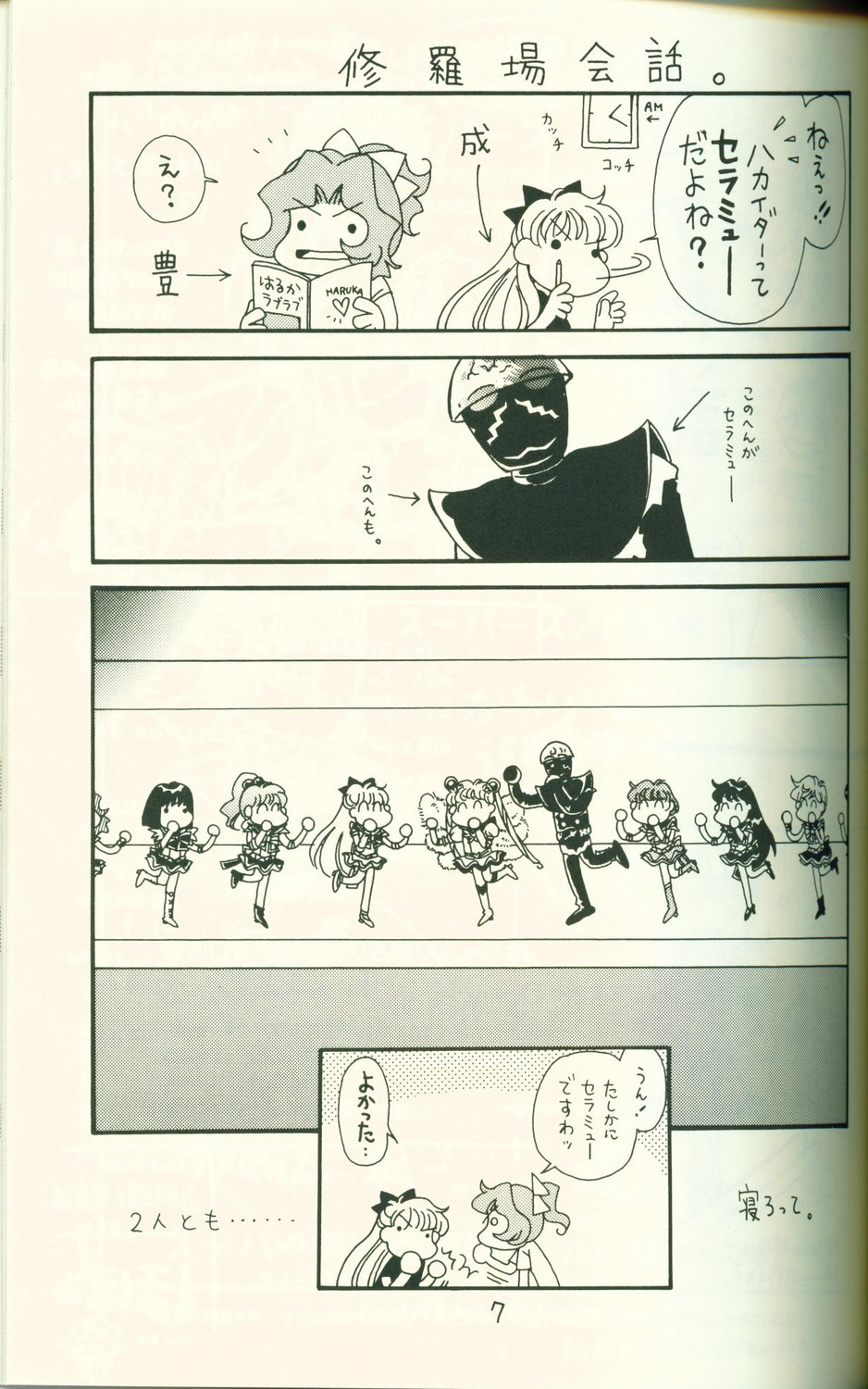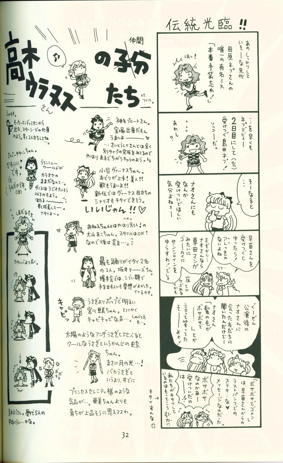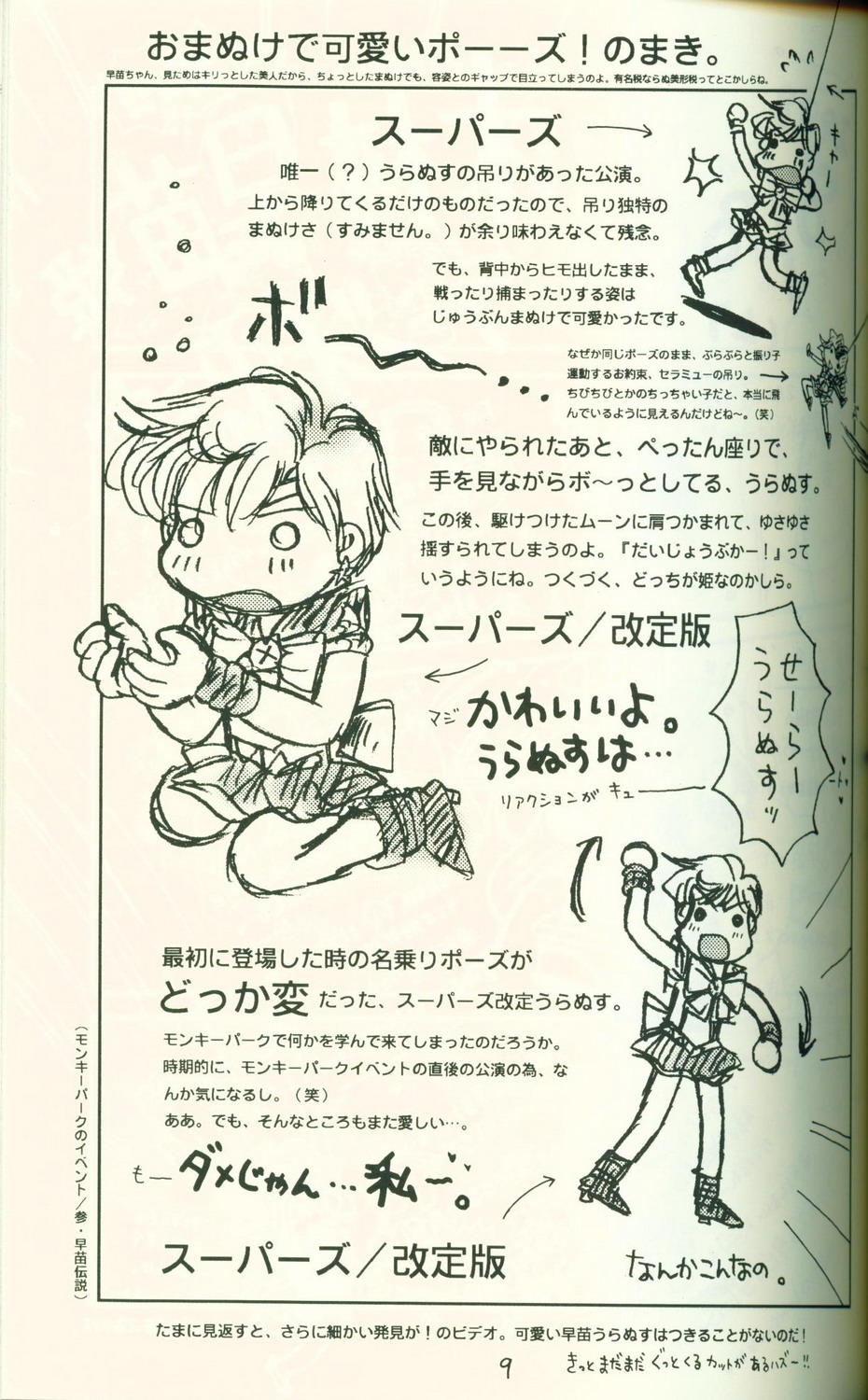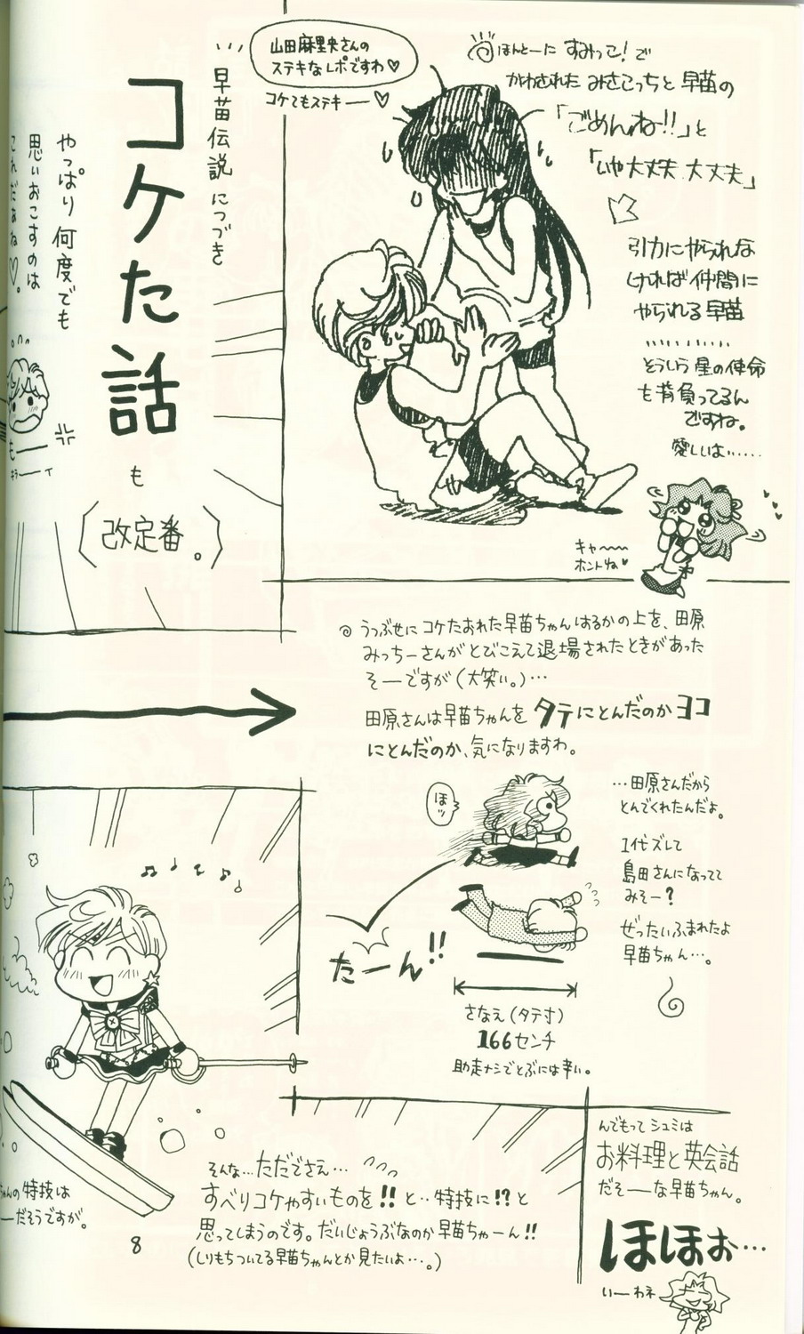 The below images come from the "Sanae Densetsu Kaiteiban - Nao Kourin" doujinshi (published fan made manga) by Tapioca Musume, posted here with permission and courtesy of Samantha of Seramyu Antics. Most of them contain Haruka (Sailor Uranus) from the Sailor Moon Musicals, but the other senshi also make appearances :).