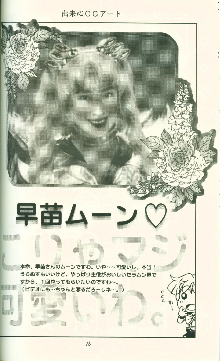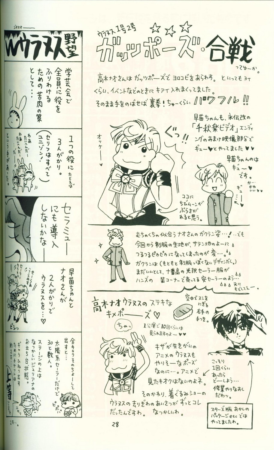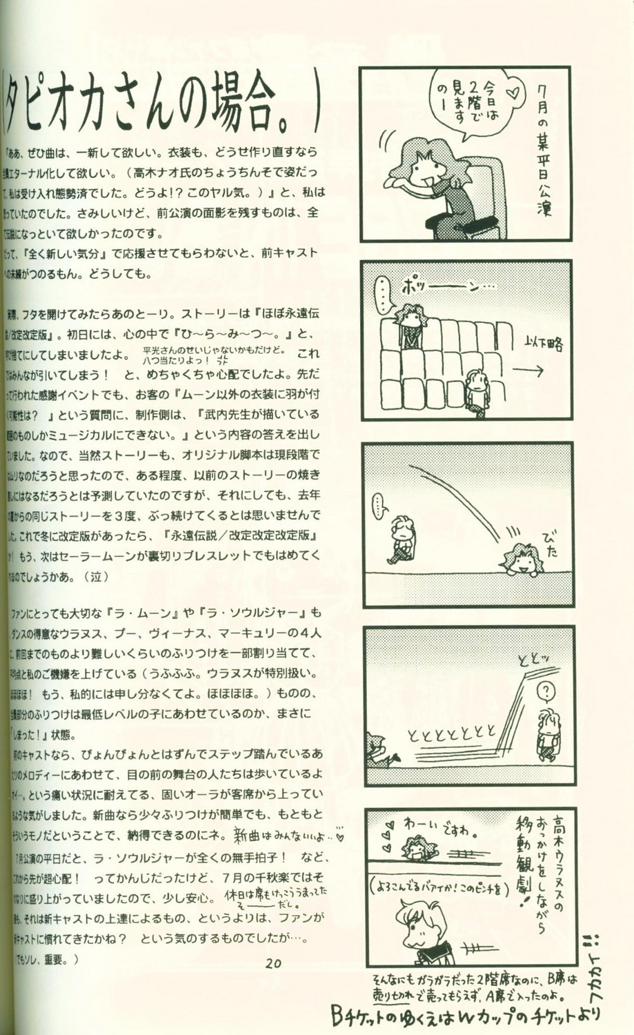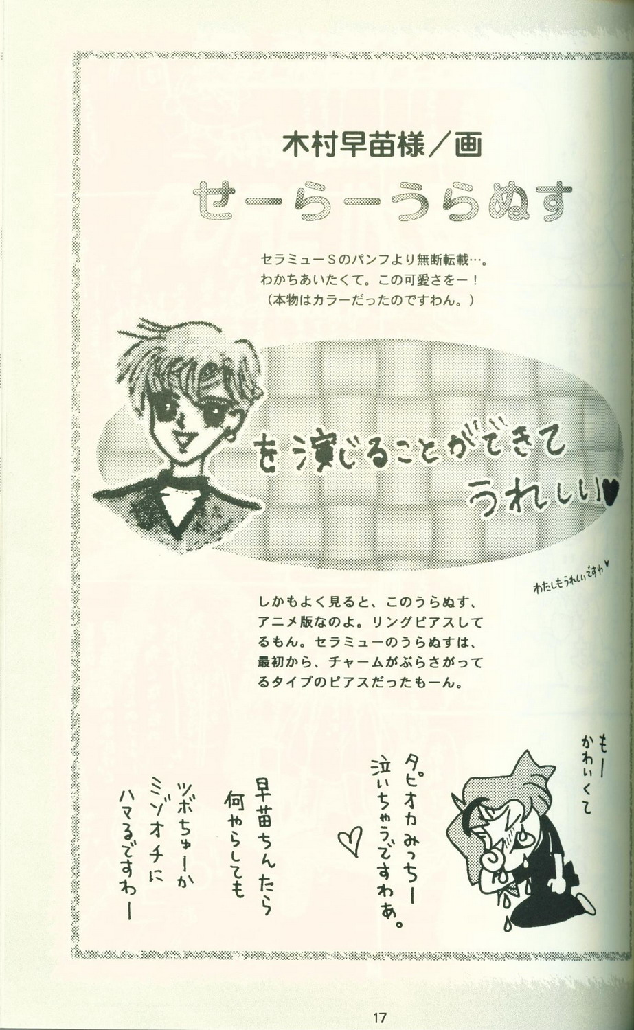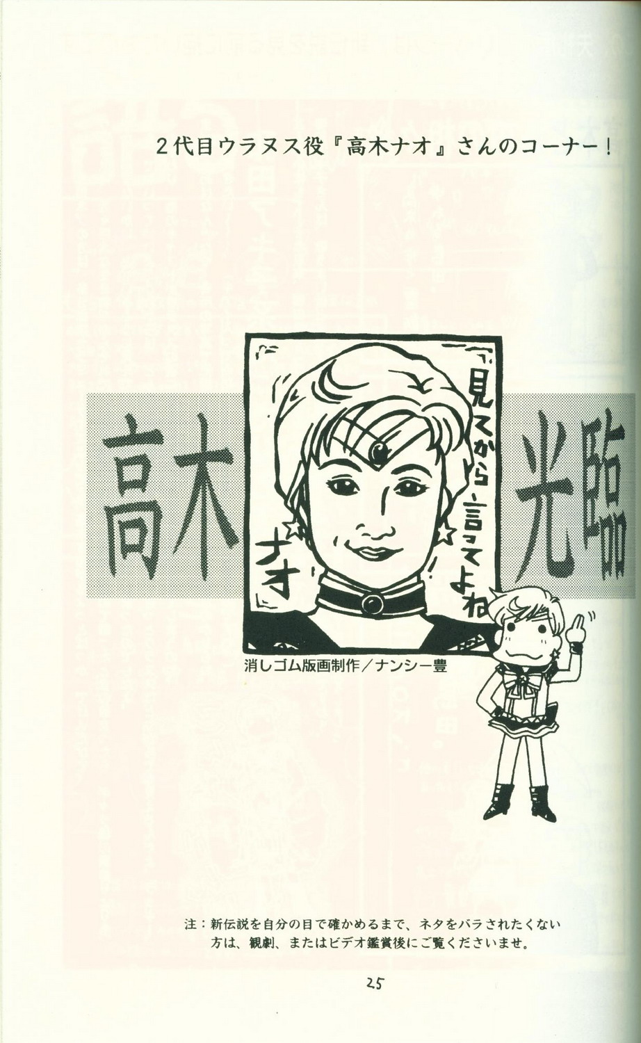 The below images come from the "Sanae Densetsu Kaiteiban - Nao Kourin" doujinshi (published fan made manga) by Tapioca Musume, posted here with permission and courtesy of Samantha of Seramyu Antics. Most of them contain Haruka (Sailor Uranus) from the Sailor Moon Musicals, but the other senshi also make appearances :).