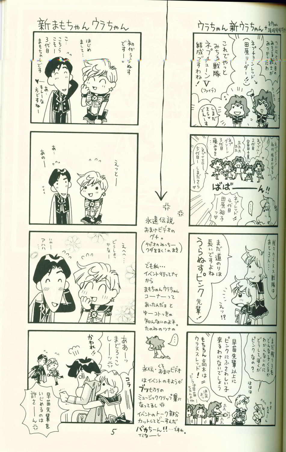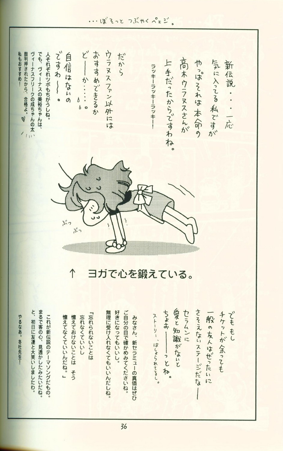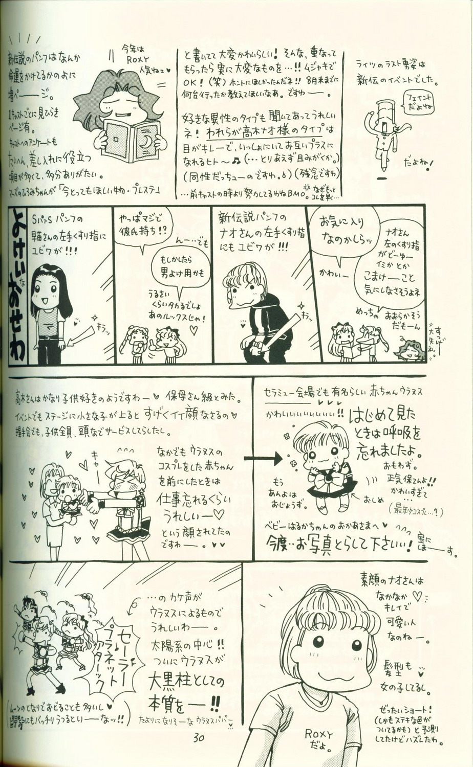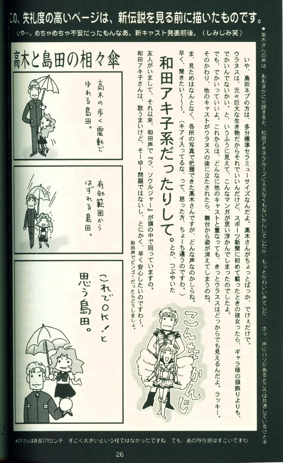 The below images come from the "Sanae Densetsu Kaiteiban - Nao Kourin" doujinshi (published fan made manga) by Tapioca Musume, posted here with permission and courtesy of Samantha of Seramyu Antics. Most of them contain Haruka (Sailor Uranus) from the Sailor Moon Musicals, but the other senshi also make appearances :).