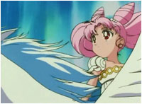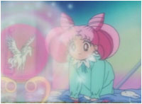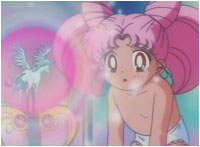 In episode 158, PallaPalla casted a spell which turned Chibimoon into an adult, and Sailor Moon into a child. Sailor Chibimoon is pleased with her adult form, however she fails to call upon Pegasus. Chibiusa later tries to contact Pegasus through the Stallion Reve, but again, there's no response from him which upsets her.