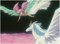 In episode 159, Chibiusa and Helios enter a dream together, where they intimately embrace before she rides on Pegasus's back over the city night scape. Suddenly he rises higher into the sky and above pink clouds, where a flock of birds fly pass them. To Chibiusa's surprise, wings appeared on her back, which allowed her to fly freely on her own. Here the two of them play with each other peacefully in the sky and enjoy every moment.