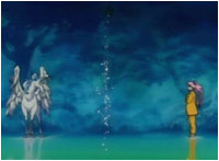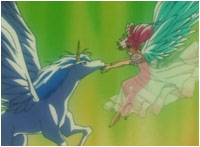 During a battle, Super Sailor Moon and Super Sailor Chibimoon were separated from Pegasus, being trapped in a force field with the enemy. Pegasus becomes both desperate and helpless, as his powers alone were not strong enough to save them on his own. The four inner senshi's power were no match for it yet they distrusted Pegasus and refused to accept his power. Pegasus continuously charges into the force field barrier in attempt to save her, getting injured seriously in the process. This heart-breaking scene shocks the Inner Senshi and seeing Pegasus in so much pain, Chibimoon begs them to believe in him and his powers. They eventually trust him and their powers drastically increase, breaking the barrier.